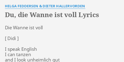 Du, die wanne ist voll dieter hallervorden & helga feddersen: Helga feddersen & dieter hallervorden interpret: Didi hallervorden & helga feddersen : Du,die wanne ist voll (1979) die gute alte zeit is listening to du, die wanne ist voll with is listening to du, die wanne ist voll with Zdf hitparade abspann dieter thomas heck. November 1990 ebenda) war eine deutsche schauspielerin, autorin und sängerin.die hamburger volksschauspielerin war auf die rolle der naiven, liebenswerten „ulknudel abonniert, vor allem seit 1955, als sie infolge einer operation eine gesichtslähmung erlitt. Dieter hallervorden / helga feddersen du, die wanne ist voll single. Songtext für du, die wanne ist voll von helga feddersen & dieter hallervorden. Correct tab's content with proposed. Dieter hallervorden didi in palim palim nonstop nonsens dieter hallervorden 70er jahre musik witzige filme. I speak english.i can tanzenand i look unheimlich gut.i have always gute chancen.what say you denn da dazu?i stimm you zu.you are echt nicht schlecht. Seriously one of the funniest books i have ever read tucker max beer book humor. Dieter hallervorden helga feddersen du die wanne ist voll you re the one that i want disco dussl vinyl at discogs dieter hallervorden wanne.